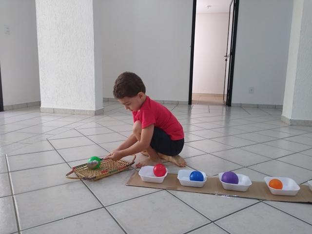 Filho, pega para a mamãe a bolinha da cor vermelha. Ele foi pegando a bolinha vermelha com duas colheres e colocando dentro da bandeja.