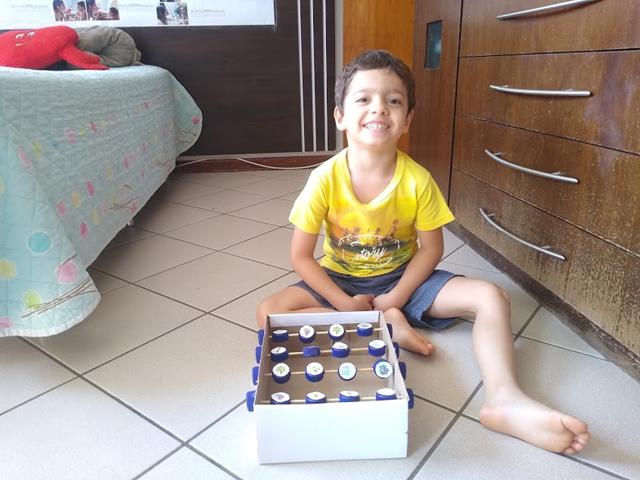 713ª Atividade: JOGO DA MEMÓRIA FEITO COM CAIXA DE SAPATO, TAMPINHAS DE GARRAFA PET E PALITOS DE CHURRASCO