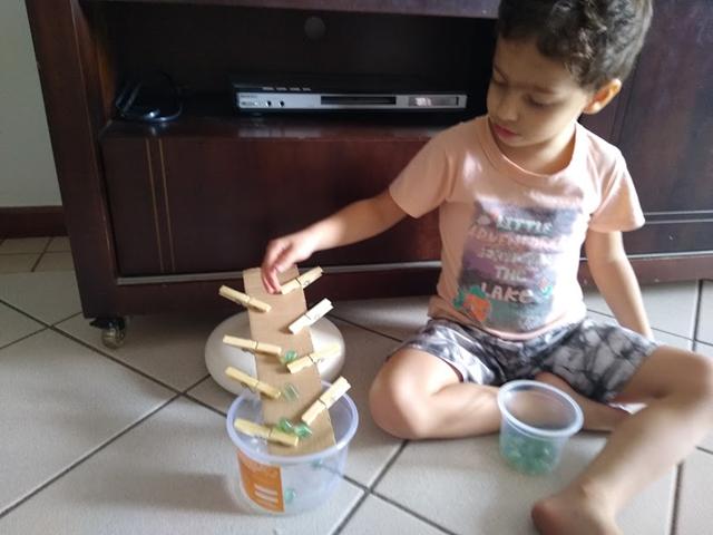 Atividade de hoje: CORRIDA DE BOLINHAS. Materiais: papelão, prendedores de roupa, bolinhas de gude e o pote de plástico descartável. Vamos criar esse labirinto! BRINCAR IMPORTA. Olha que genial. A ideia é fazer a bolinha rolar. Davi Antonios gostou bastante.  #maeemdia #brincarjunto #tempojunto #maternidadereal #maternidadeativaeconsciente #educandocomamor #DaviAntonioscom3anose11meses