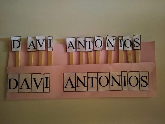 593ª Atividade: PAREAMENTO DAS LETRAS DO NOME “DAVI ANTONIOS” EM PALITO DE PICOLÉ COM O AUXÍLIO DA PLAQUINHA