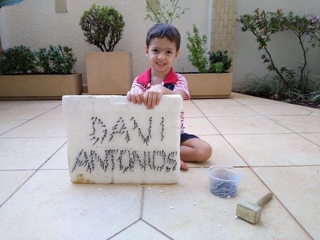 Conhecendo as letras do nome próprio: DAVI ANTONIOS. Atividade de hoje: Martelar o prego sobre o contorno das letras com seu nome. Fiz essa atividade pelo interesse dele que mais gosta: MARTELO. Escrevi o nome Davi Antonios e fiz alguns pontinhos com a canetinha nas letras, pra que ele colocasse os pregos. Uma maneira divertida de aprender a escrita do…  [Leia mais]