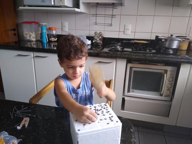 502ª Atividade: PEDAÇO DE ISOPOR + PAPEL ALUMÍNIO + PREGO + PREGADOR DE ROUPA