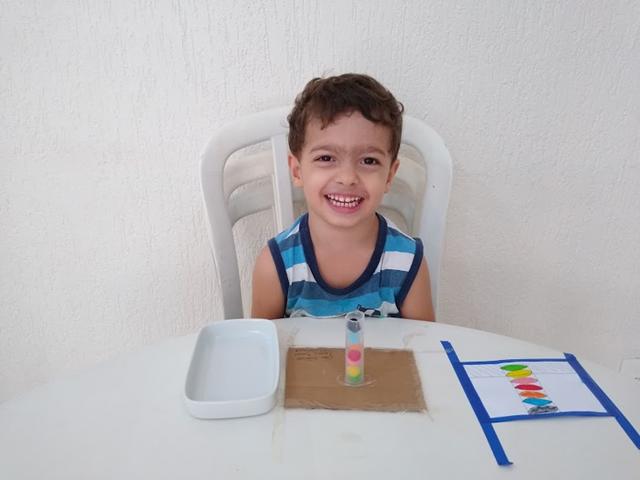 Seringa, pompons e cartelas com sequência de cores. O objetivo da atividade é colocar os pompons na seringa de acordo com a sequência de cores indicado na cartela com o uso da pinça jacaré. Trabalha o raciocínio lógico, percepção visual, coordenação motora e cores. Afinal, aprender brincando é sempre muito mais legal! . Davi Antonios gostou muito. #maeemdia…  [Leia mais]