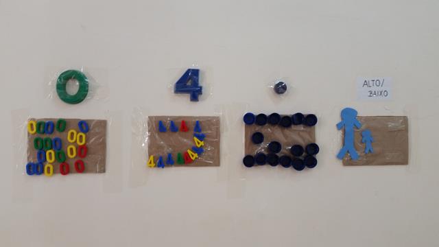 399ª Atividade: GRUDAR A VOGAL O, NÚMERO 4, COR AZUL E IDENTIFICAR O CONCEITO ALTO/BAIXO (PAPEL EVA - VOVÔ/DAVI) NO SEU LUGAR