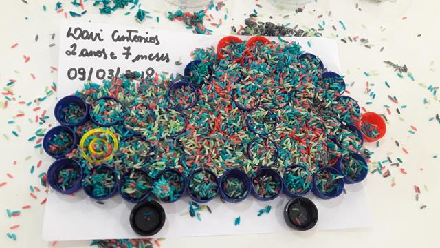 251ª Atividade: ENCHER AS TAMPINHAS COM O ARROZ DAS CORES CORRESPONDENTES USANDO O MEDIDOR DE LEITE – CARRO