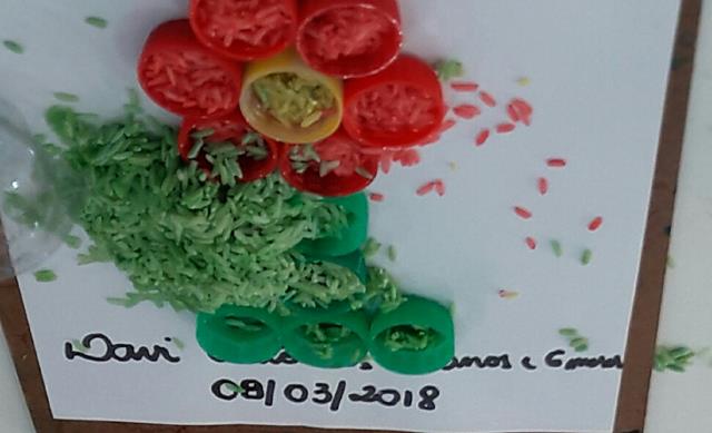 255ª Atividade: ENCHER AS TAMPINHAS COM O ARROZ DAS CORES CORRESPONDENTES USANDO O MEDIDOR DE LEITE – FLOR