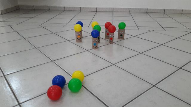 256ª Atividade: COLOCAR A BOLA DE PLÁSTICO DA CABELEREIRA DO PALHAÇO DE ACORDO COM A COR CORRESPONDENTE DO NARIZ E JOGAR A BOLINHA PARA DERRUBAR OS PALHACINHOS