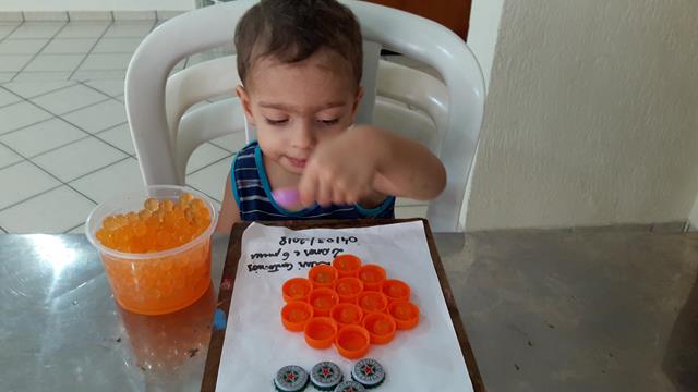 Essa foi a atividade de hoje, usamos bolinhas de gel! Para quem não conhece, são umas bolinhas que algumas pessoas usam para decoração, elas vem um saquinho bem pequenininhas e depois de algumas horas na água elas ficam bem grande!! A mamãe colou com cola quente as tampinhas em forma da fruta laranja. A mamãe perguntou para o Davi Antonios:…  [Leia mais]