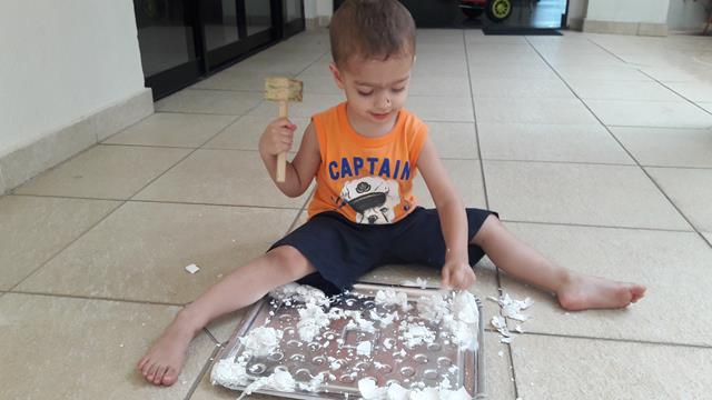 Hoje foi o dia de martelar... Quebrar as cascas de ovos é uma atividade super gostosa. Essa atividade trabalha a coordenação visomotora, força, concentração e paciência. Foi um sucesso! Davi Antonios AMOU essa atividade... #maeemdia #brincarjunto #tempojunto #maternidadereal #maternidadeativaeconsciente #educandocomamor #DaviAntonioscom2anose5meses