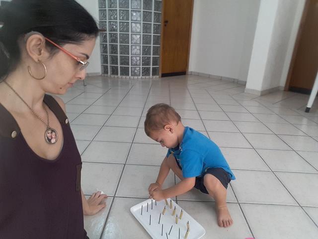Atividade de coordenação motora com encaixe de macarrão penne no parafuso. Logo que o Davi Antonios, muito concentrado, descobriu a novidade, ele veio muito curioso e começou a encaixar o macarrão no parafuso. O objetivo é que o meu pequeno encaixe o macarrão no parafuso e o empilhe. Fácil para nós, mas nem tão fácil para o pequeno que está…  [Leia mais]