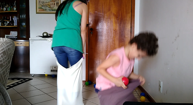 3- Devem pegar as bolinhas de plástico colorido para colocar dentro da fronha;