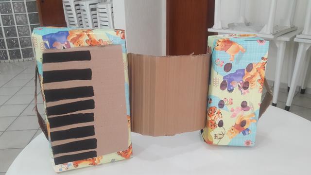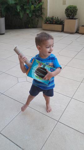 A mamãe criou um VIOLÃO com caixa de sapato, linguinha elástico e rolo de papel alumínio; uma MARACA com lata de leite de ninho vazia, grãos de feijão e rolo de papel alumínio; um TAMBOR com lata de meleca vazia, canetinha e bexiga; um CHOCALHO com colher (medidor) de sopa de alumínio, grãos de feijão e bexiga; uma FLAUTA com canudinhos e fita durex; uma SANFONA com caixa de sapato, papelão e papel de presente. Tudo muito simples, prático e divertido! Mãos à obra!