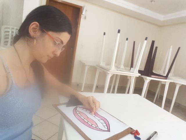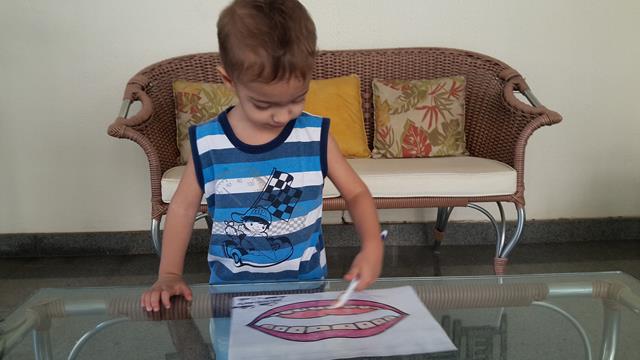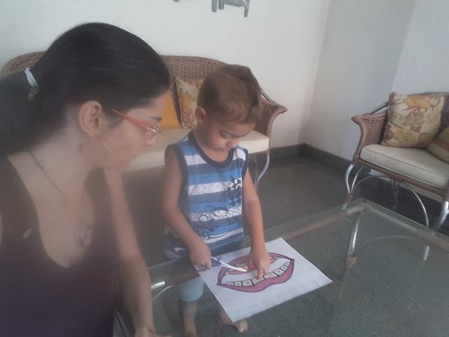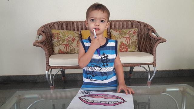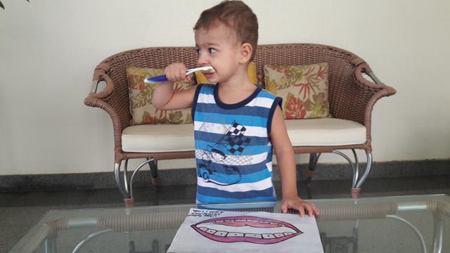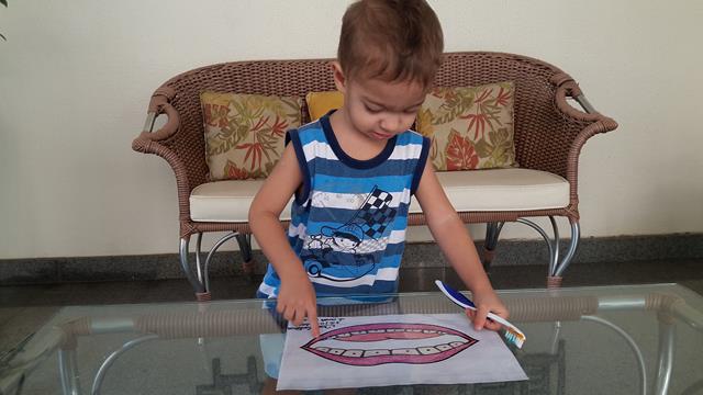 Uma brincadeira bem simples, escovando os dentes. Imprimi esse dente no Google e falei para ele que os dentes estavam preto e sujos, expliquei que precisava escovar para ficar branquinho.