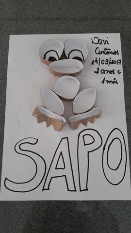 Rolo de papel higiênico se transforma em um lindo sapinho quando colados em um papel. Então, a mamãe colocou o sapinho feito com o rolo no papel, lógico antes de cortar os rolos eu pedi para o Davi Antonios pintar com tinta guache verde.