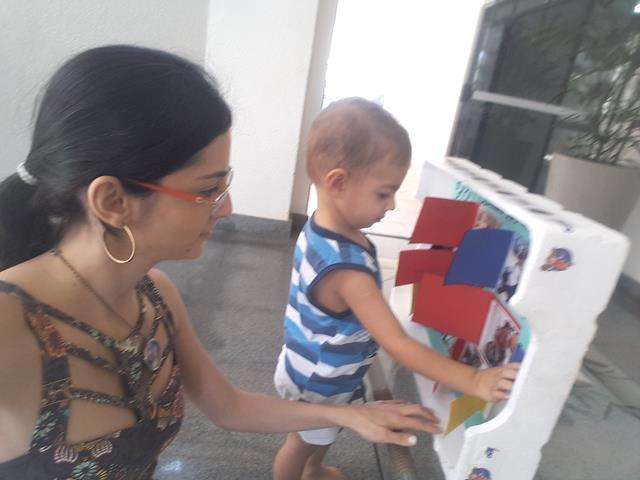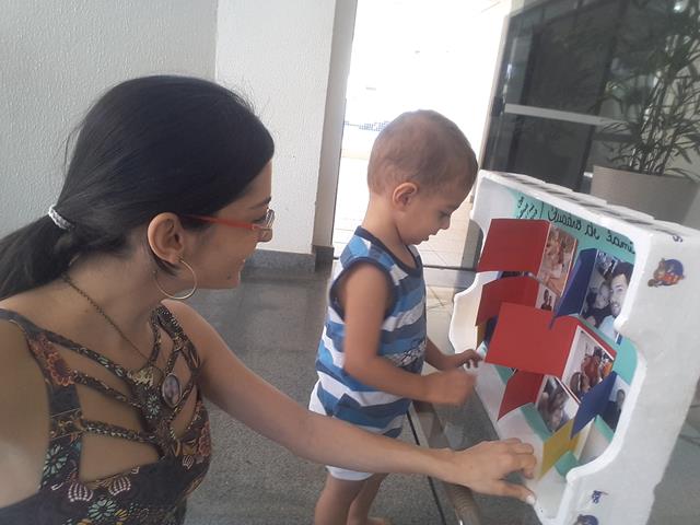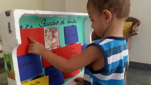 Nosso mural começou com fotos de família, a mamãe utilizou papel de cartolina, recortou as fotos, um a um com a tesoura e colou na caixa de isopor. Em cada “quadro”, coloquei uma foto de cada membro de família como mãe/pai, avó/avô, tio/tia e madrinha/padrinho e usei plaquinhas com os nomes de cada um para que o Davi Antonios pudesse compreender suas origens, achei que esta era a forma ideal, sem nomes escritos, apenas com fotografias de pessoas felizes que fazem parte da história do Davi Antonios. Achei que ficou bem alegre e de simples compreensão, como era o objetivo. Ele ADOROU! Na minha casa, em cima da mesa, tem porta-retrato, ele sobe na cadeira e fica olhando o tempinho nas fotos. E acho que ainda tem uma função afetiva também, às vezes, ele beija determinada foto.