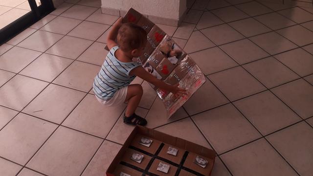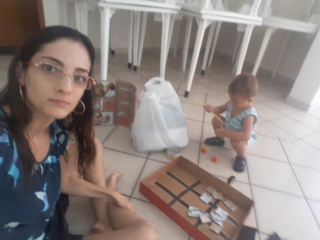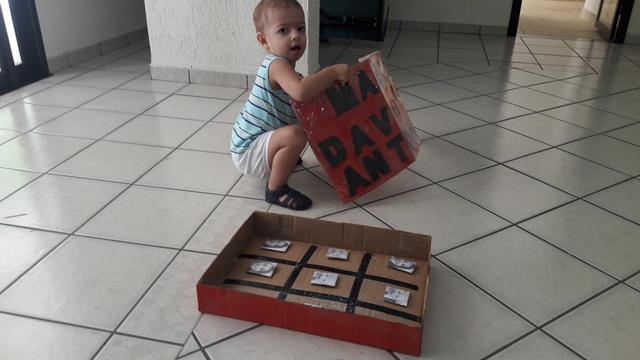 Eu fiz o jogo de memória de papelão para Davi Antonios brincar e ele simplesmente amou! O novo brinquedo do meu filho não me custou nadinha. Usei a criatividade, algumas horas e o material disponível em casa. Na verdade, fiz esse jogo para ele se divertir com as pecinhas das imagens entre “mãe & filho” porque ele tem apenas 1 ano e 7 meses e não sabe ainda brincar com um jogo de memória. Mas além de criar um brinquedo artesanal com o papelão, a minha intenção foi a de apresentá-lo às novas “imagens” e ensiná-lo a identificar as imagens do jogo, para que os poucos ele entenda expressando os sentimentos. Esse material possibilita ajudar a criança a entender os sentimentos. Enquanto ele brincava com o jogo de memória de papelão que construí, observei o interesse dele em colocar as pecinhas uma ao lado da outra, formando assim uma grande fileira. Ora montava a fileira em linha reta e em outro momento ele as colocou em uma linha ondulada. Fiquei surpresa com a criatividade dele na brincadeira. Foi muito legal ver de pertinho a experimentação criativa dele, muito fofo!! A mamãe “corujando” a todo instante, não tirava os olhos do filhote e percebeu que com esse brinquedo novo, espontaneamente, transcorreram positivos estímulos ao imaginário e à criatividade da criança, novas descoberta e momentos de alegrias que resultaram em palmas e muitos sorrisos pra nós. Muito legal! Davi Antonios ficou muito feliz com o novo brinquedinho!