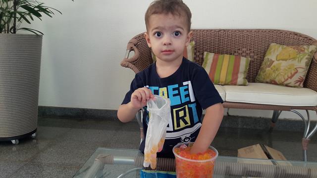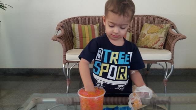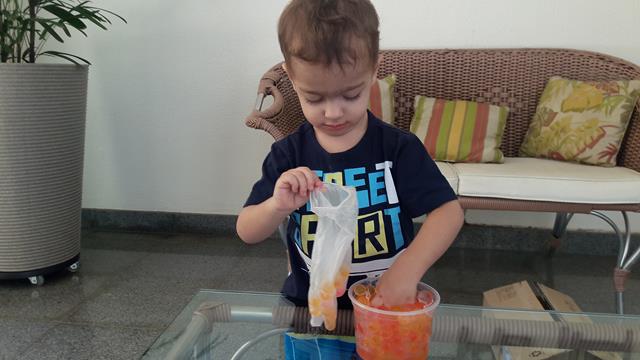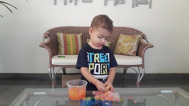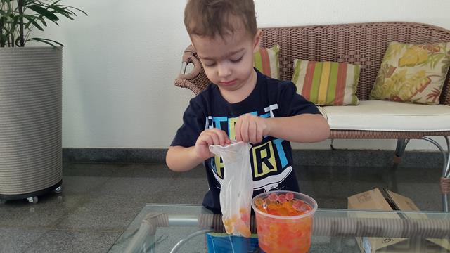 Quando a mamãe guardou as bolinhas de gel numa vasilha, então aproveitamos outra brincadeira.