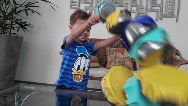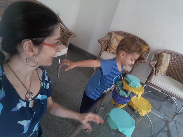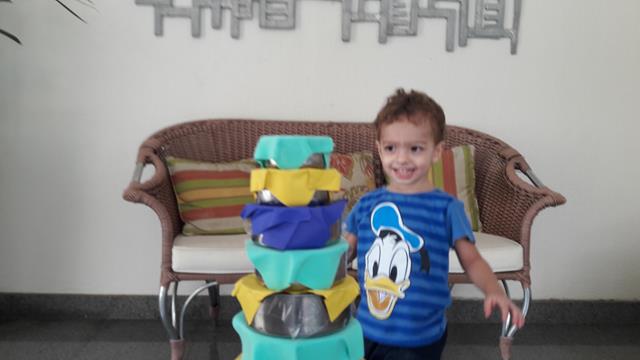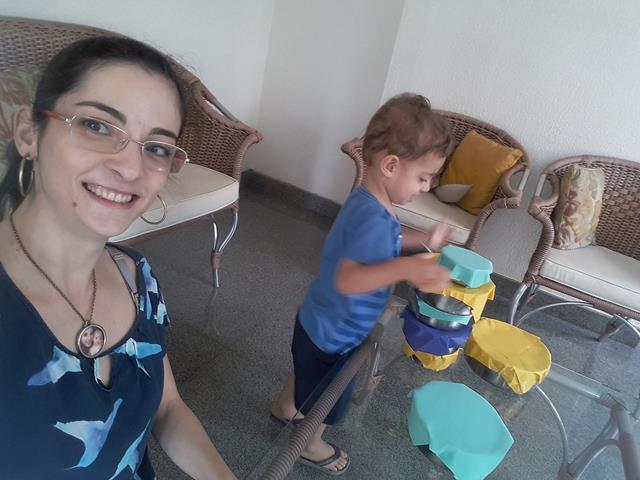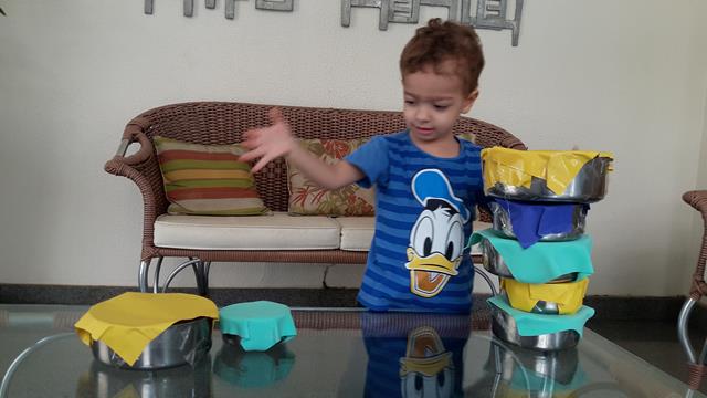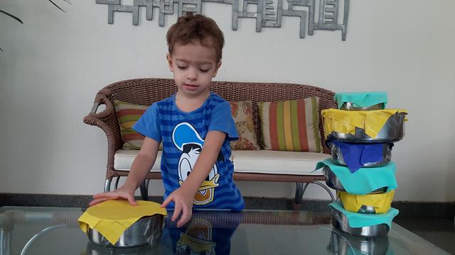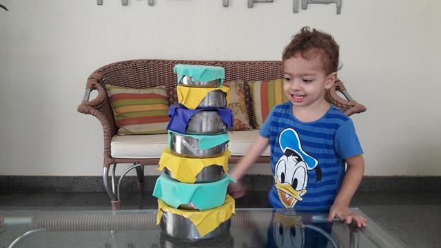 Na cozinha, Davi Antonios adora pegar as vasilhas da vovó Fátima para brincar. Então, a mamãe preparou uma atividade sensorial para a construção da Torre. Essas vasilhas ficaram sem tampas, “sumiram”. Por isso a mamãe enfeitou o papel EVA como se fosse uma tampa.