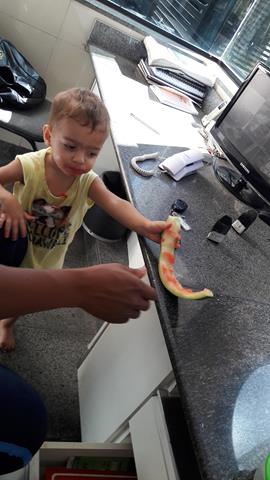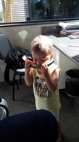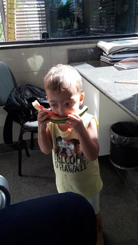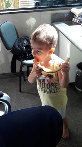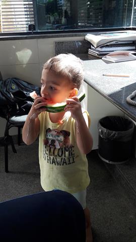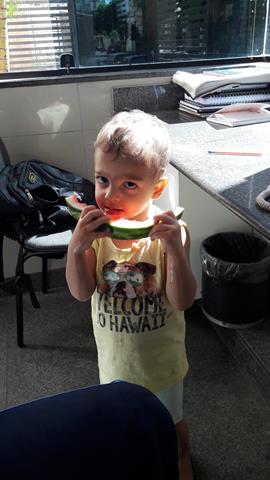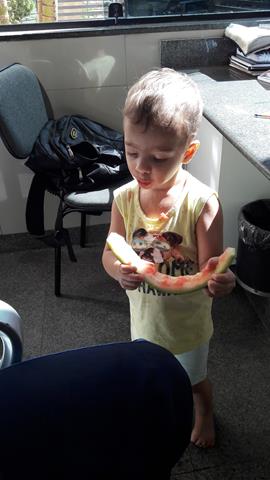 Davi Antonios comendo uma deliciosa melancia e com esse sorriso encantador no rosto, todo lambuzado.