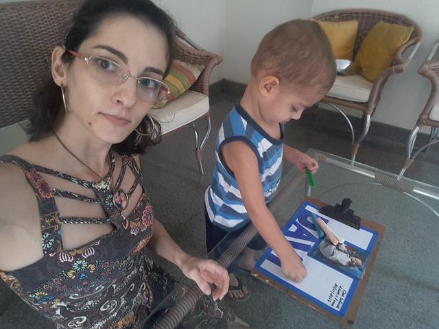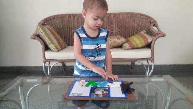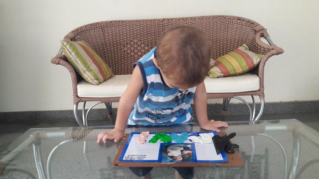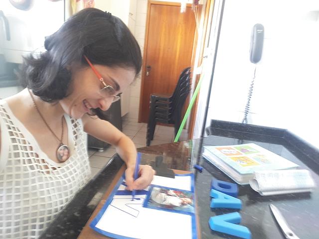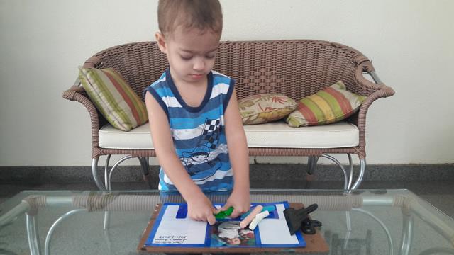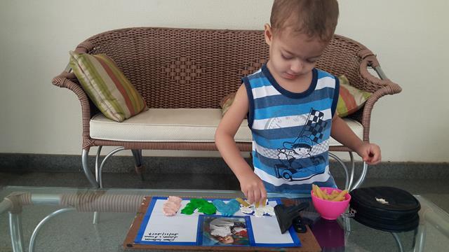 A mamãe preparou o material como fita adesiva, foto do Davi Antonios, alfabeto móvel, canetinha, massinha e macarrão.