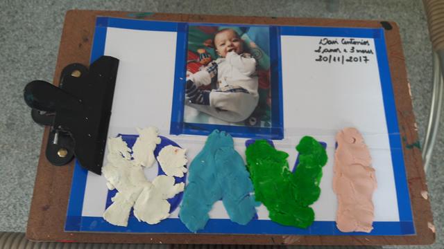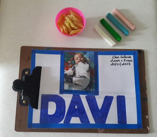 A mamãe colou uma foto do Davi Antonios e colocou uma fita adesiva em uma margem. Desenhou o nome DAVI do alfabeto móvel e pintou com canetinha.