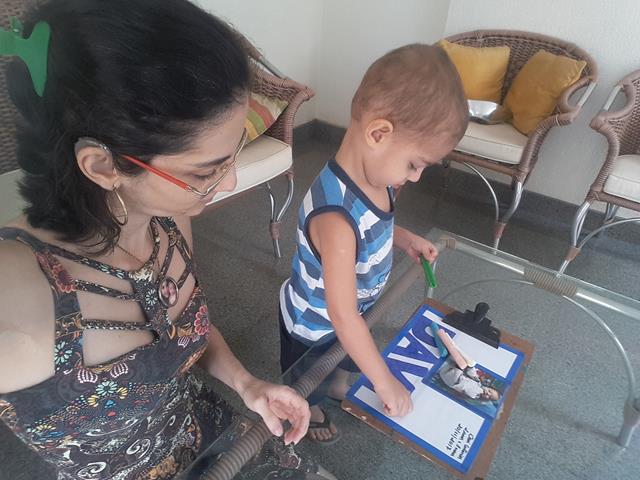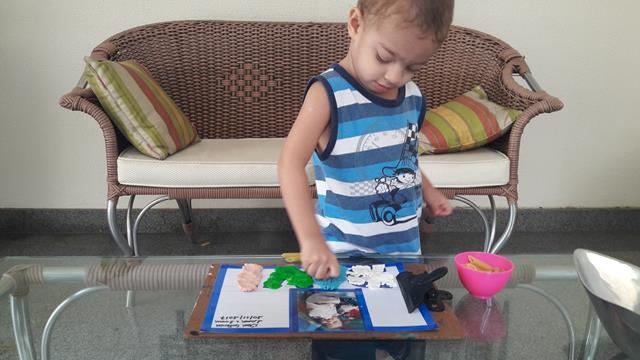 Com a ajuda da mamãe, amassando a massinha com contorno das letras do nome DAVI. A mamãe pediu para o Davi colocar macarrão em cima da massinha.