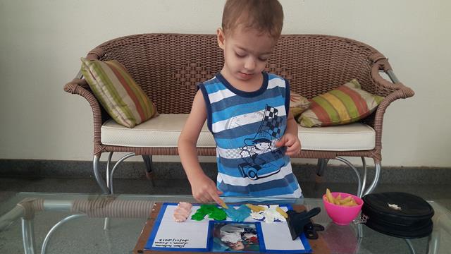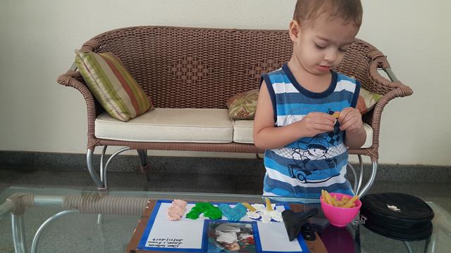 De quebra, ainda estimulo a coordenação motora fina, quando o Davi pega os pedacinhos da massinha.