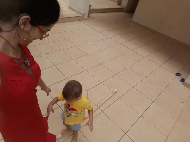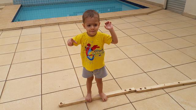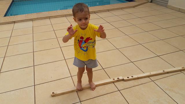 A mamãe encontrou ripas de madeira na rua. O exercício de hoje é o deslocamento sobre os pés. Treinando a coordenação motora grossa, a lateralidade, o equilíbrio e a percepção corporal. Parece um exercício simples, não é? Mas, para que Davi Antonios pudesse se deslocar sobre essa linha reta, ele direcionou sua atenção para manter o equilíbrio e o ritmo durante o deslocamento.