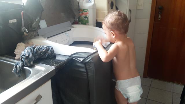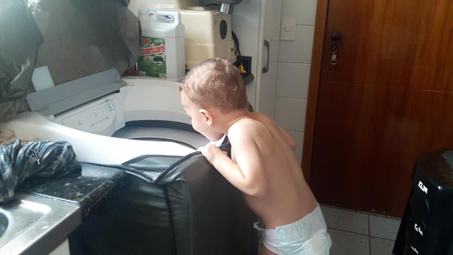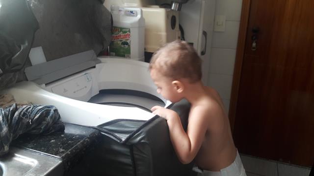 Após a escola, Davi pega o uniforme sujo, leva para a lavandeira, sobe no banquinho e coloca na máquina. Ele tem autonomia e liberdade para circular pela casa sem medo. Independência, liberdade, amor ao trabalho, autodisciplina e respeito.