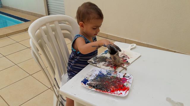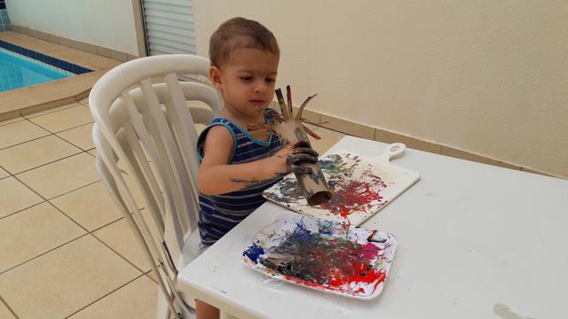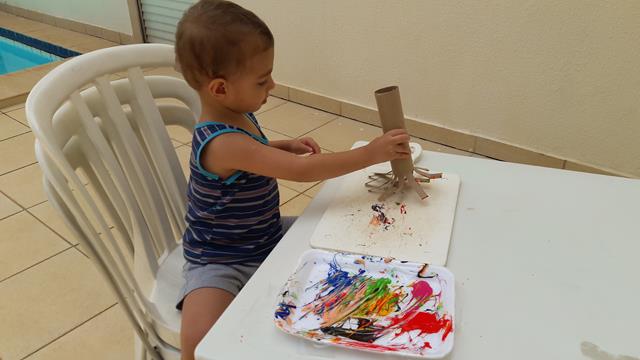 A mamãe recortou o tubinho de papel alumínio para se tornar sensacional carimbo e colocou a tinta guache de várias cores diferentes na bandeja de isopor para o Davi Antonios carimbar na bandeja. Uma atividade de preensão, força e coordenação motora fina. Foi lindo! Brincou muito. #maeemdia #brincarjunto #tempojunto #maternidadereal #maternidadeativaeconsciente #educandocomamor #DaviAntonioscom2anose5meses