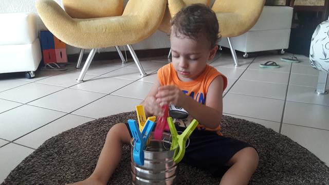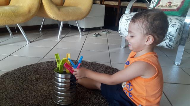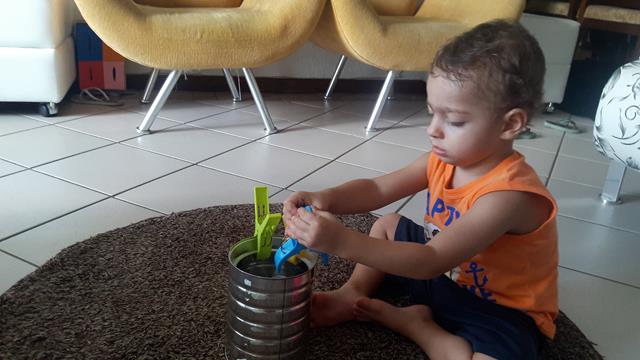 Olha ele aí! Uso essa lata pra muita atividade! É só olhar algo que vejo que dá pra usar, estou inventando! Pus pregadores e ele já aperta direitinho, muito fofo! No início, o Davi Antonios teve dificuldade para abrir o pregador. E ele já abre e fecha o pregador direitinho e adorou a brincadeira. O exercício da capacidade de força no movimento de “pinça” favorece muito o desenvolvimento motor e fortalecimento dos dedinhos da criança. Nessa brincadeira treina-se muito o uso dos dedos polegar e indicador esse movimento de força e aquisição de habilidade são essenciais para a fase da escrita. ❤ #maeemdia #brincarjunto #tempojunto #maternidadereal #maternidadeativaeconsciente #educandocomamor #DaviAntonioscom2anose6meses