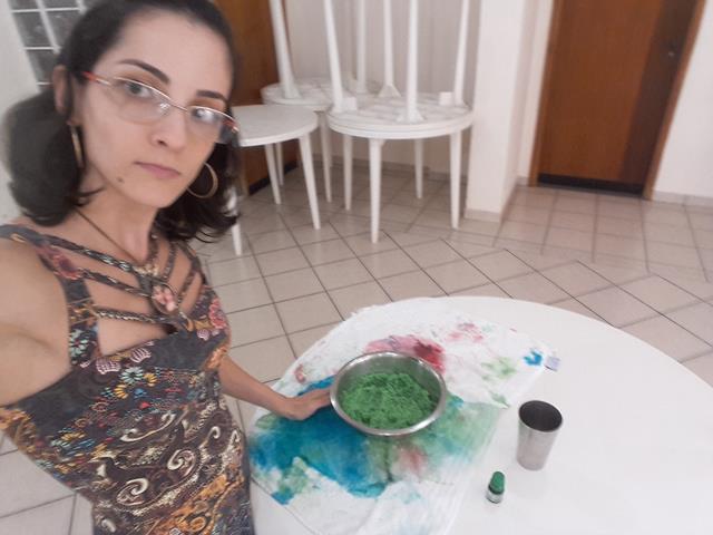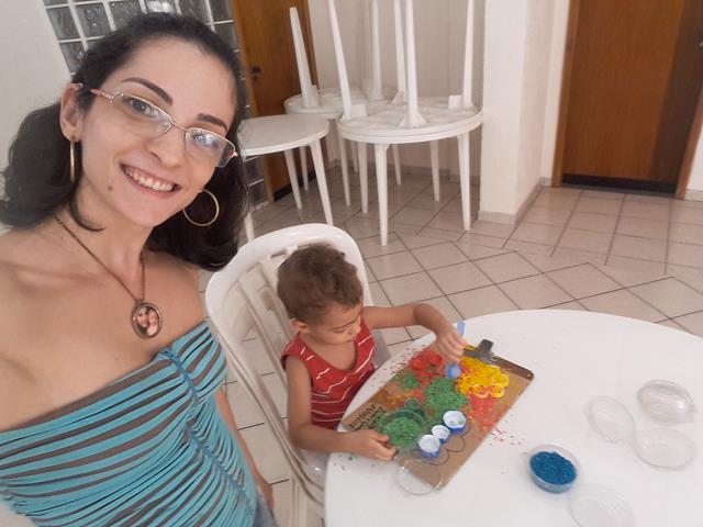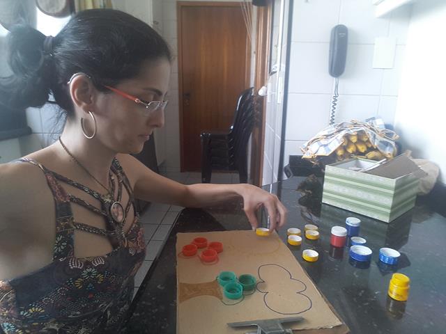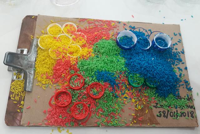 A mamãe recortou um pedaço de papelão, desenhou um sol, nuvem, flor e árvore. Colou com cola quente as tampinhas com as cores correspondentes. A mamãe colocou arroz com a água, adicionou corante alimentício numa vasilha para mexer e depois colocou no pano para enxugar e esperar secar.