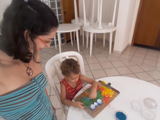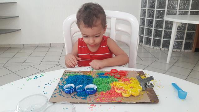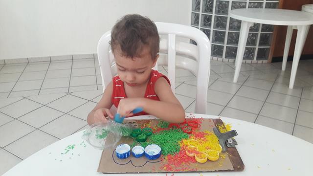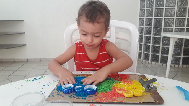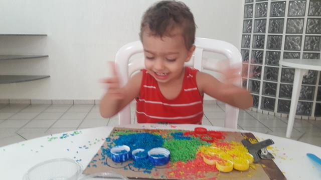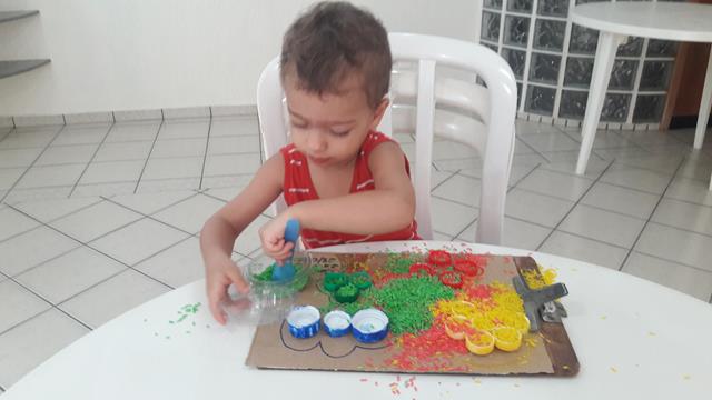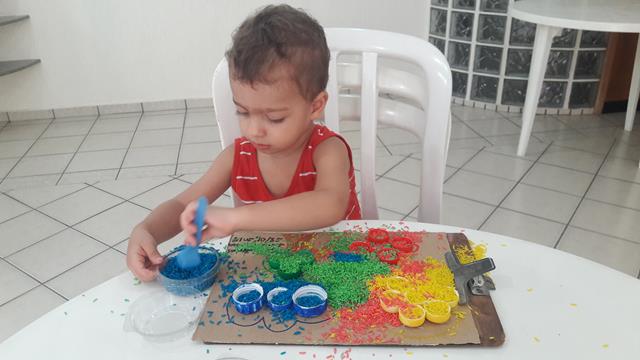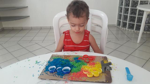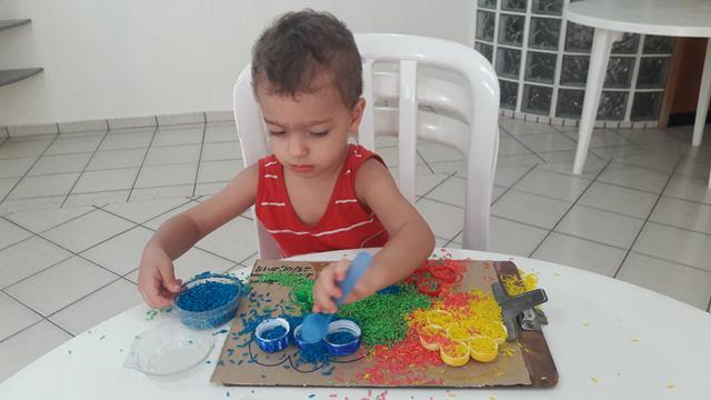 O objetivo é encher as tampinhas com o arroz usando o medidor de leite, trabalhando a percepção de vazio e cheio, coordenação motora e coordenação das cores. A mamãe ofereceu a atividade para o Davi Antonios e não orientou a parear as cores nem nada. Ele conhece muito bem, a maioria das tampinhas ele pareou, outras fez toda colorida. A mamãe gosta de brincadeira livre.