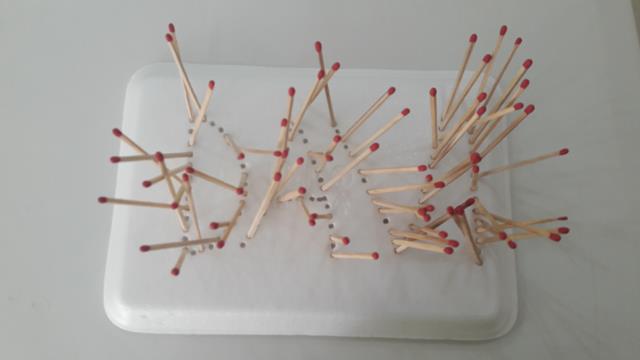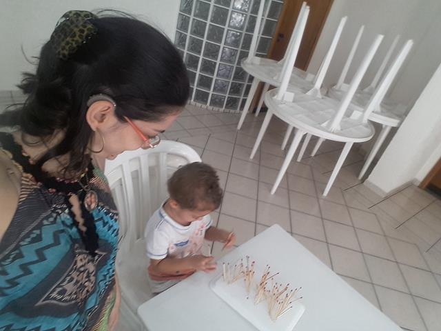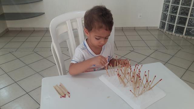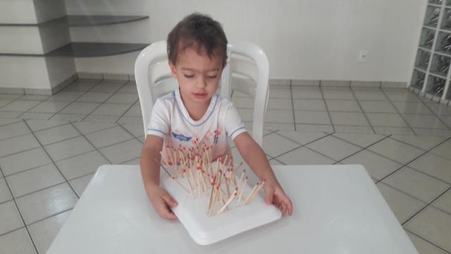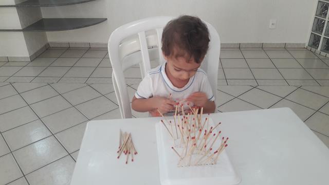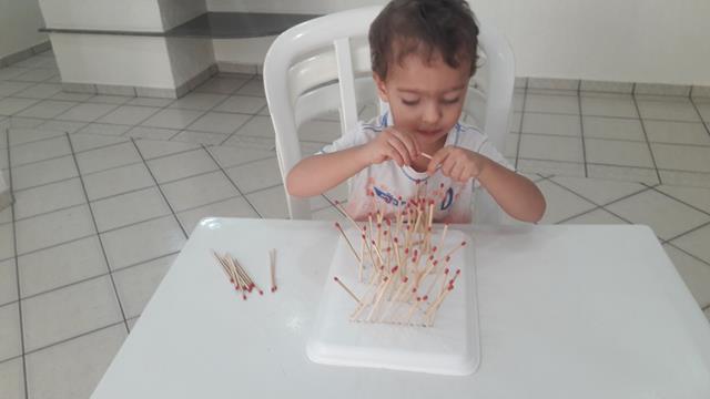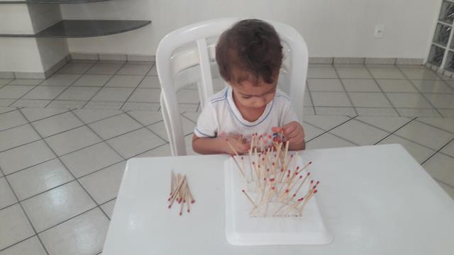 Para essa brincadeira a mamãe furou as letras do nome DAVI em uma bandeja de isopor. A ideia é colocar o palito de fósforo correspondente à letra. Favorece a concentração e coordenação motora.