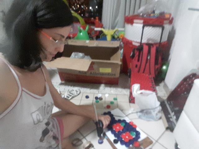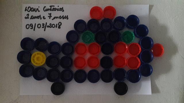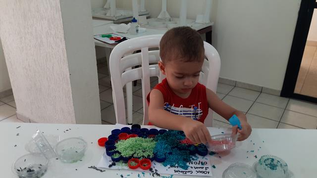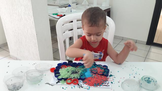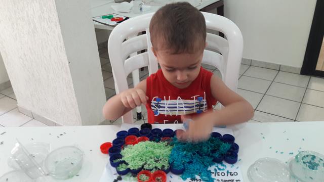 O que mais chama atenção do Davi Antonios para brincar é ARROZ COLORIDO. A mamãe colou com cola quente as tampinhas em forma de um CARRO DE POLÍCIA. O objetivo é encher as tampinhas com o arroz usando o medidor de leite, trabalhando a percepção de vazio e cheio, coordenação motora e coordenação das cores.