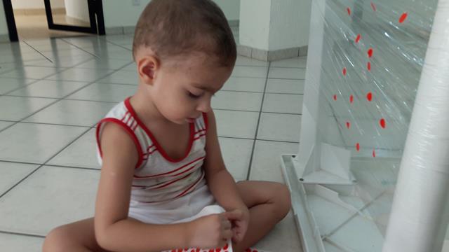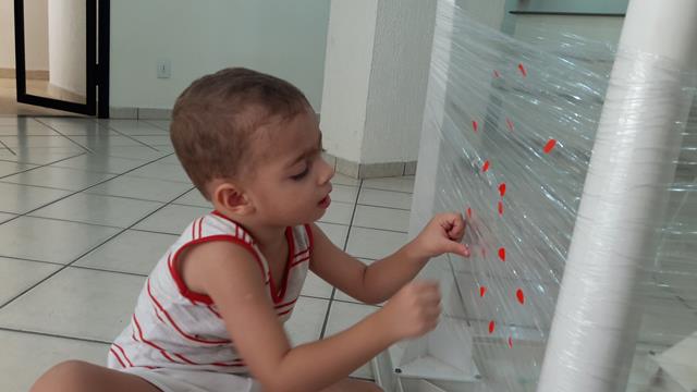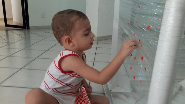 Quem conhece sabe o quanto ele é ativo, porém sempre quando eu faço as brincadeiras ele se concentra de tal forma que muitos me perguntam como faço. Deixo ele brincar, assim ele explora, experimenta, se diverte, se concentra, desenvolvendo habilidades necessárias para o crescimento. A mamãe colocou o plástico filme em volta da mesa de cabeça para baixo. Ele simplesmente ama fazer: ADESIVO!!! Ele cola e veja que beleza pra o movimento de pinça. Davi amou a atividade.