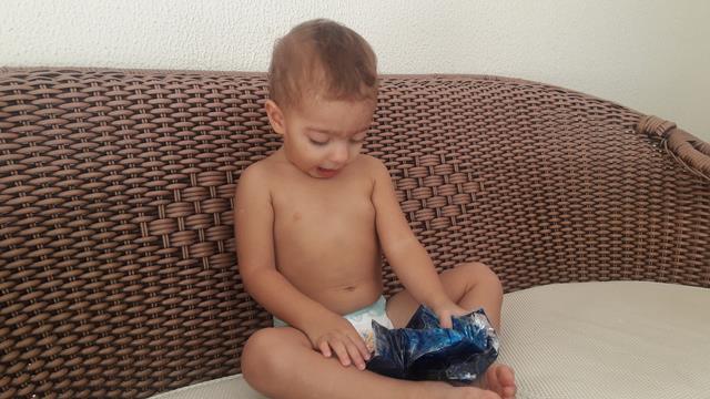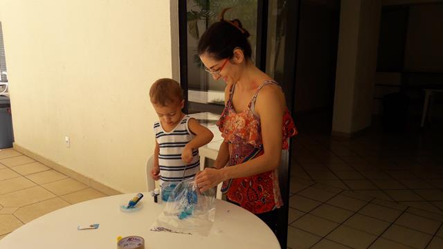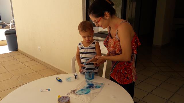 E hoje a atividade de estimulação sensorial foi logo após o café da manhã! Utilizamos com gel, cola gritter, lantejoulas (pacotes de luas) e corante alimentício AZUL. Davi amou participar da parte de gel na sacola. Ele se divertiu e curtiu bastante a atividade.