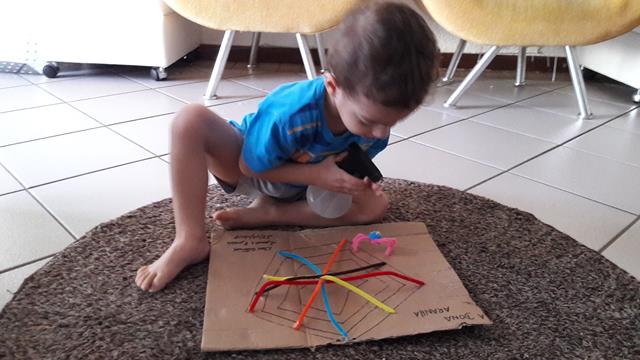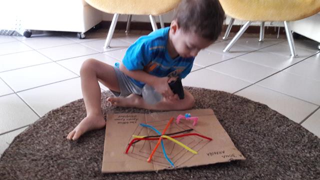 Boooom diiia genteee!! Quem tá dodói e mesmo assim tá feliz e brincando?! Levanta a ✋ e diga: “Ow coisa chataaaaaa”. E lá vamos a uma horinha de atenção EXCLUSIVA da mamãe e uma dose de disciplina com AMOR ❤. A mamãe fez o desenho da teia no papelão e usou o limpador de cachimbo, olhinhos móveis e o pompom para criar uma aranha.