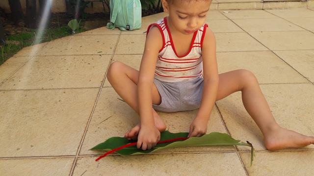 Atividade simples: A LAGARTA. Materiais: Folha verde e Limpador de cachimbo. A mamãe fez o furo bem pequeno em uma folha verde para o Davi Antonios passar a lagarta (limpador de cachimbo). Ele adorou a brincadeira e se divertiu bastante explorando sua coordenação motora fina com a mamãe. #maeemdia #brincarjunto #tempojunto #maternidadereal #maternidadeativaeconsciente #educandocomamor #DaviAntonioscom2anose9meses