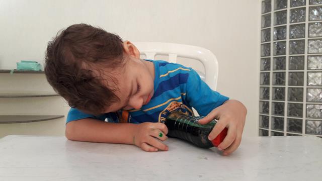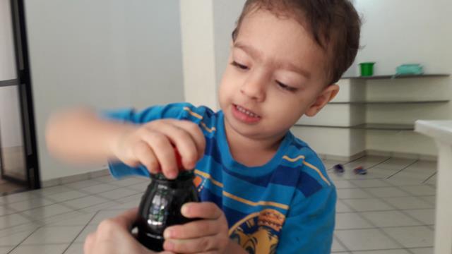Atividade de hoje: GARRAFINHA CALMANTE. Materiais: Garrafinha, água, glitter verde, cola glitter, lantejoula verde e corante alimentício verde. O objetivo é encher a garrafinha com todos os materias e depois sacudir. Quando virou Davi Antonios percebeu que o glitter e a lantejoula foram para o fundo do pote. “O pote da calma é usado para acalmar crianças pequenas após uma briga ou choro. Inspirado no Método Montessori, o objetivo é distrair e tranquilizar os pequenos com o corante alimentício e glitter colorido se movendo dentro do recipiente. Assim, eles aprendem a respirar fundo e se acalmar. Além de proporcionar um momento para que se expressem e tentem explicar os motivos da tristeza, raiva ou frustração."