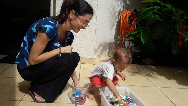Para a atividade de hoje eu coloquei um pouco de água numa caixa organizadora de plástico e joguei dentro as tampas de refrigerantes, maionese, leite, amaciante, ... O Davi brincou com isso de várias maneiras possíveis. Primeiro ele quis tirar todas as tampas de dentro da água. Desta foi a vez de colocar tudo de volta. Num determinado momento ele descobriu pegando a peneira as tampas e foi colocando dentro do pote plástico. Outra coisa muito divertida foi simplesmente usar as mãos para brincar com a água. Ele ficou uma hora fazendo todas essas experiências. Dá para ver pela cara dele que achou uma delícia brincando com água nesse calor! #maeemdia #brincarjunto #tempojunto #maternidadereal #maternidadeativaeconsciente #educandocomamor #DaviAntonioscom1anoe8meses