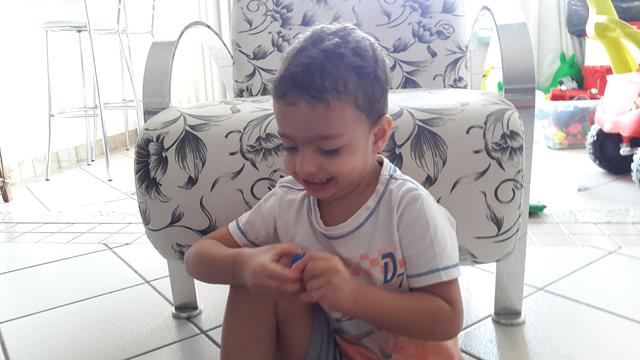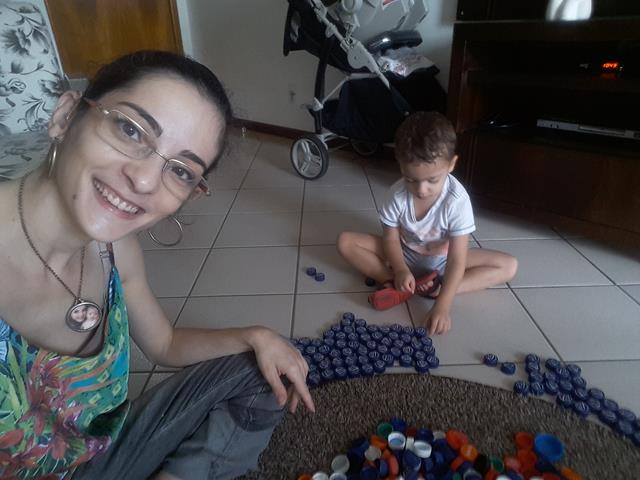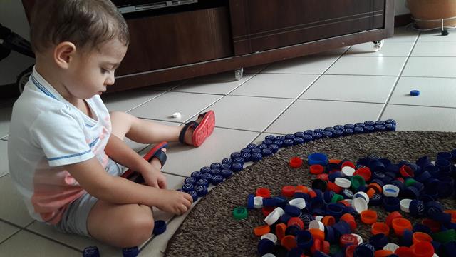 Foi só colocar a sacola no meio da sala e logo o Davi veio, curioso. Afinal, tampinhas são mesmo muito lúdicas! É o poder dos objetos não-estruturados, que deixam a criança decidir como quer brincar.