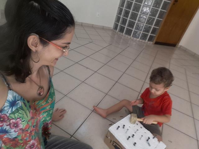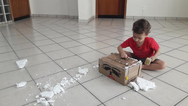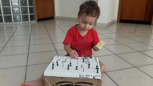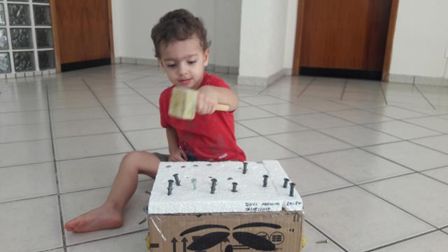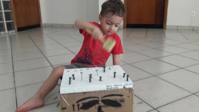 A nossa atividade de hoje é: MARTELAR O PREGO. Trabalhar a coordenação motora fina do jeito que o Davi Antonios mais gosta: MARTELO. A mamãe pegou a caixa de papelão e desenhou a cara do homem bravo e triste. Depois, pegou os pedaços de isopor e colou com cola quente em cima do papelão. No isopor, a mamãe colocou muitos pregos. Davi Antonios segurou o prego com uma mão e com a outra bater o martelo, acertando a parte achatada. É muito legal ver a coordenação dele. Lógico que a mamãe não deixa brincar sem supervisão, sempre fica por perto. Ele com os seus dois anos e dez meses faz direitinho e sem ajuda. Então fica sempre de olho. Essa atividade desenvolve habilidades motoras finas ao pegar a cabeça do prego com a ponta dos dedos, fortalece a mão em preparação para a escrita e estimula independência e concentração. A brincadeira fez sucesso e Davi Antonios repetiu muitas vezes. #maeemdia #brincarjunto #tempojunto #maternidadereal #maternidadeativaeconsciente #educandocomamor #DaviAntonioscom2anose10meses
