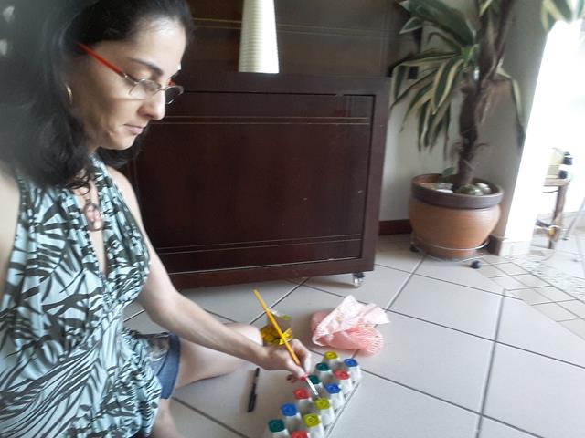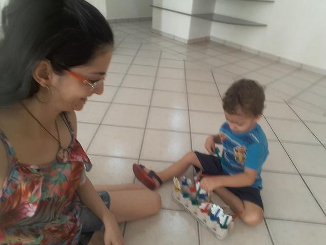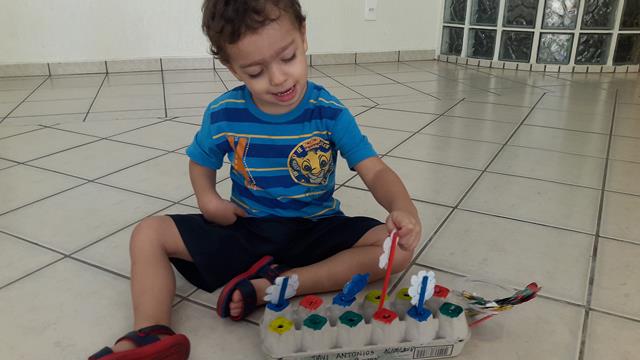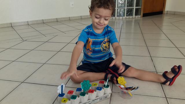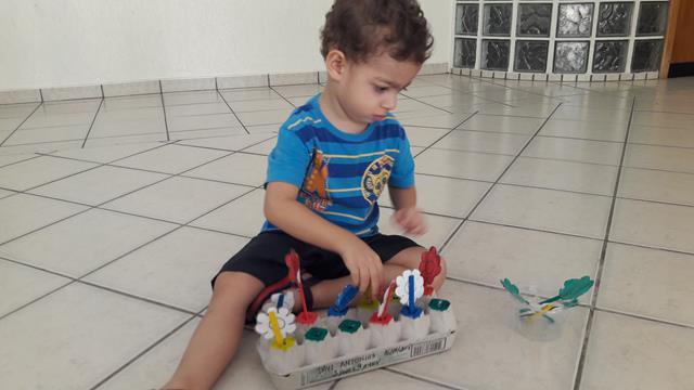 Atividade de hoje: PAREAMENTO DE CORES COM ARRANJOS DE FLORES E ENCAIXE. Simples, mas excelente atividade de pareamento. A mamãe pintou a caixa de ovo com cores diferentes e fez o furo. Depois, desenhou e pintou flores com papel contact para não rasgar. Pintou o palito de picolé e colou com cola quente a flor.