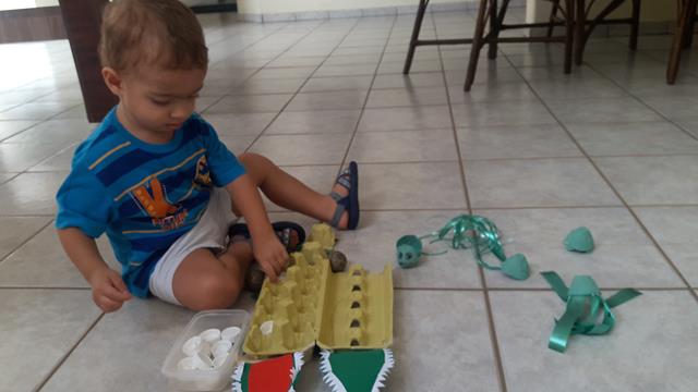 É uma delícia cantar e brincar com ele esta música. Logo, o Davi observou o que tem dentro do jacaré, Estrela-do-Mar, Concha, Polvo e Água-Viva. Tinha as tampinhas. Ele pegou as tampinhas e colocou na vasilha. É uma ideia para trabalhar a cor verde, coordenação viso motora, percepção visual, atenção, reciclagem e musicalização... Brinquedos têm muitos significados nas vidas de adultos e crianças. Eles permitem refletir, observar, ganhar habilidades, aprender. Isso se eles já estejam prontos. Mas, a brincadeira pode ir além: fazer o próprio brinquedo e dizer que FUI EU QUE FIZ COM MUITO CARINHO E AMOR!.. Simplesmente ele encantou os brinquedos e se divertiu bastante. #maeemdia #brincarjunto #tempojunto #maternidadereal #maternidadeativaeconsciente #educandocomamor #DaviAntonioscom1anoe8meses