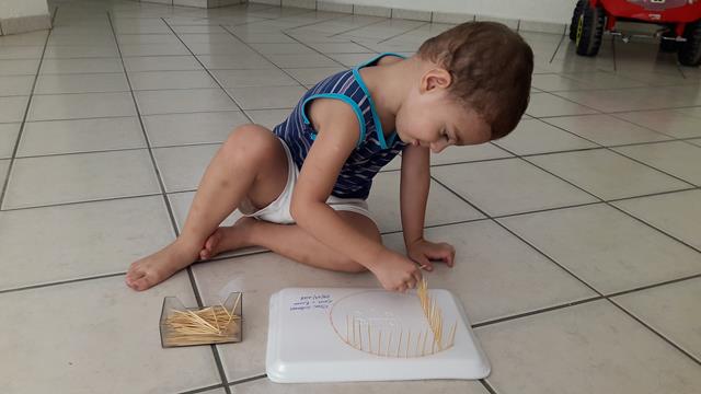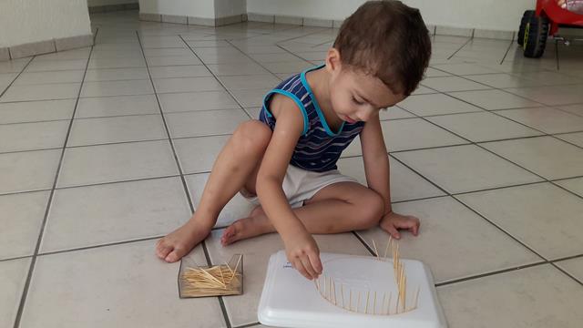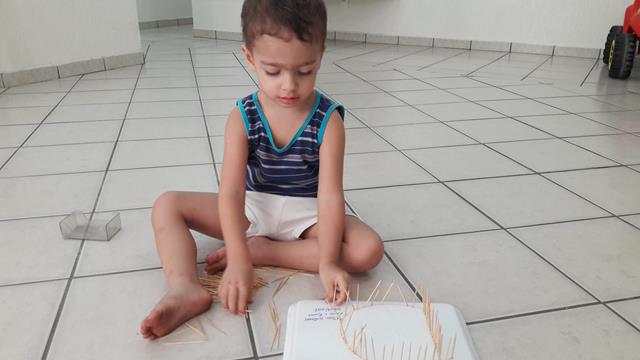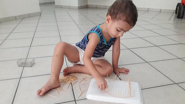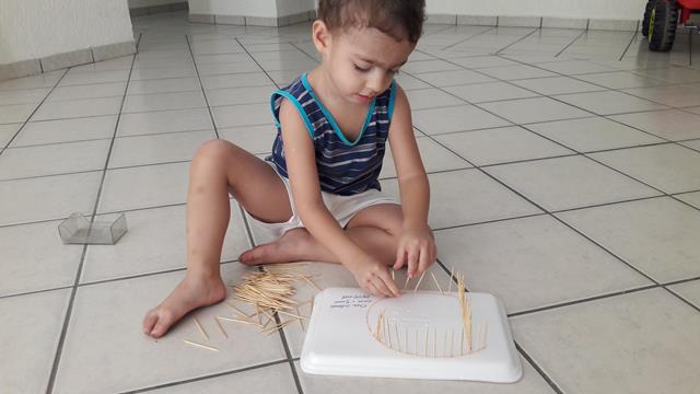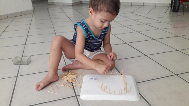 Mais um brinquedinho feito com materiais simples e fáceis de achar em casa. Aqui, estamos trabalhando muito com a coordenação motora fina para aperfeiçoar o movimento de pinça, então temos que inventar o que fazer! :) A mamãe utilizou bandeja de isopor e escreveu a letra D o nome Davi. Disponibilizou para o Davi Antonios o palito de dente para trabalhar o contorno do nome dele. Ele ficou uns bons 30 minutos concentrado e falando o nome dele. Trabalhamos movimento de pinça e concentração.