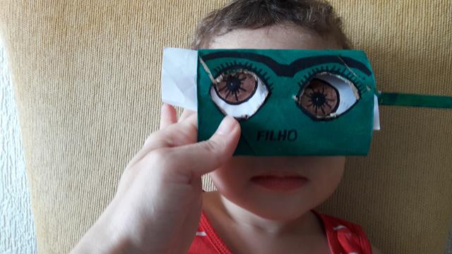 Nesse caso, a mamãe usou a tesoura para criar recortar o rolo de papel higiênico dos olhos. A mamãe desenhou os olhinhos no papel A4 e depois colou com cola quente em cima do palito de picolé.