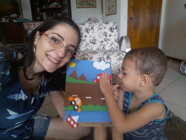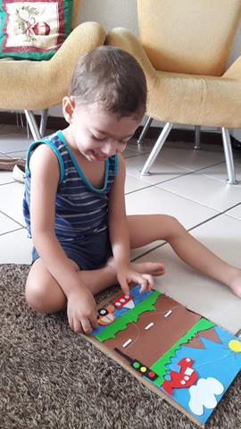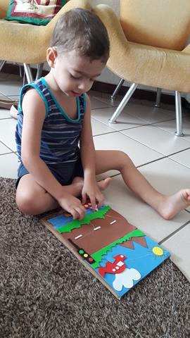 Davi Antonios anda muito interessado o veículo e a mamãe resolveu fazer um painel utilizando papelão, E.V.A de diversas cores e barbante.