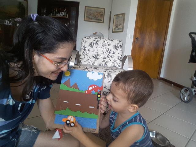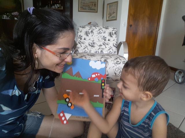 No vídeo, a mamãe apontou o dedo e perguntou: “Filho, o que é isso?”. Ele respondeu: “Carro”. A mamãe foi puxando o barbante “Para onde vai o carro?”, e assim por diante.