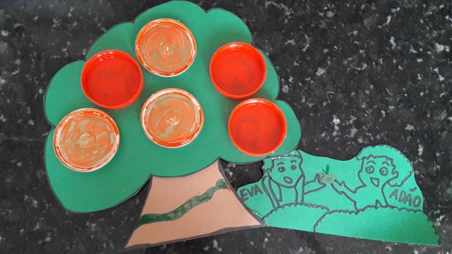 Hoje, a mamãe apresentou o Davi Antonios os dois tipos de fruto que Deus colocou no jardim, a árvore da vida e a do conhecimento do bem e do mal e contou uma história sobre o ADÃO E EVA.